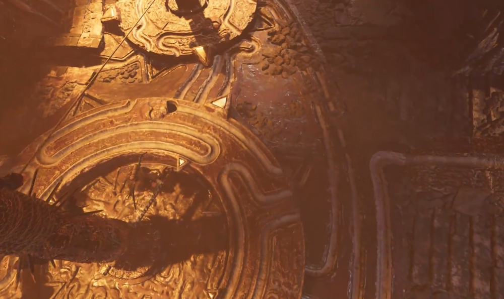 你会遇到一个由四个石磨盘组成的机关。这些石磨盘分别位于四个角落,中间有一个可以升降的平台。关键是要通过调整石磨盘的角度,让阳光反射到特定的柱子上,从而激活机关。你需要把中间的平台降下来,这需要操作1号石磨盘,左转让它反射阳光到左侧的柱子上。完成这一步后,爬到2号石磨盘所平台。