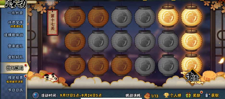 花灯解谜第17关虽然看似复杂,但只要掌握关键点击顺序即可轻松通关。根据多次验证的攻略,玩家需依次点击最后一行第二个(左二)、最后一行第五个(右二)以及第一行第三个(左三)花灯。这三个位置的点击顺序没有严格限制,但必须确保全部触发才能点亮所有花灯。该关卡的核心逻辑是将整体布局拆解为独立的十字架单元,每个点击动作会联动改变相邻上下左右的花灯状态。
