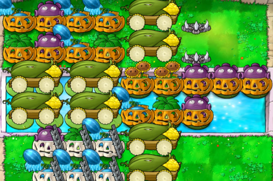 后期阵容要灵活调整,冰瓜和玉米加农炮是核心。水路前三排放忧郁菇防矿工和小鬼僵尸,陆地后排补地刺王防冰车。别忘了保护伞防气球僵尸,两个就够用,但必须套南瓜罩。每波结束前记得修补破损的南瓜和地刺,红眼巨人砸场子时优先用樱桃炸弹救急,冰蘑菇能争取关键时间。