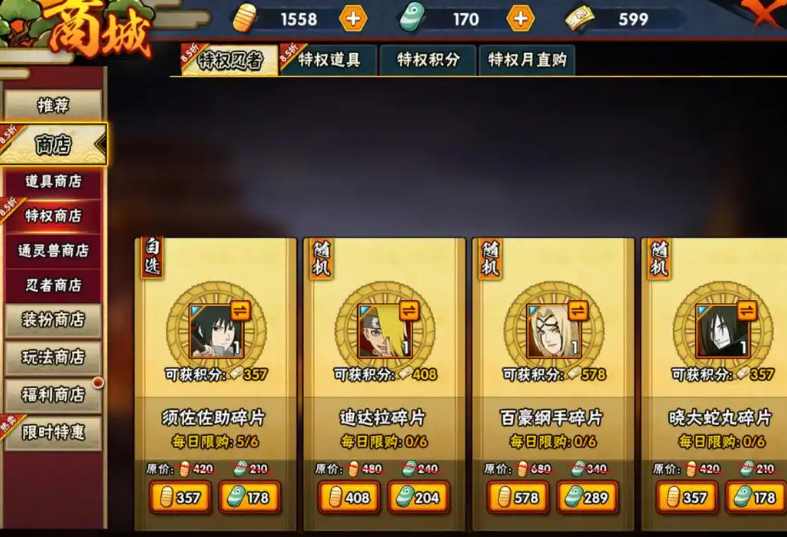 如果选择在特权商店购买S忍碎片,每个碎片价格约为680金币,合成一个完整S忍需要100片碎片,理论上需要6.8万金币。但考虑到特权积分返还机制,实际花费约为5.1万至5.5万金币。需特权商店的S忍供应有限,并非所有S忍都能随时购买,玩家需要等待特定忍者上架。