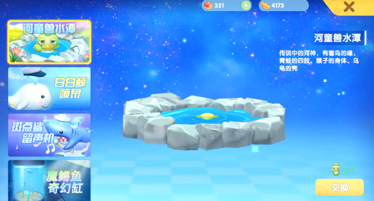 兑换河童温泉需要完成前置条件,比如解锁大力的神秘商店。找到游乐场门口的摩尔报社旁边,就能看到大力。进入商店后选择传奇阁,找到河童兽水潭选项直接兑换。这个温泉占3x3格子,摆在家园里超有氛围,河童还会偷偷探头,萌趣十足。