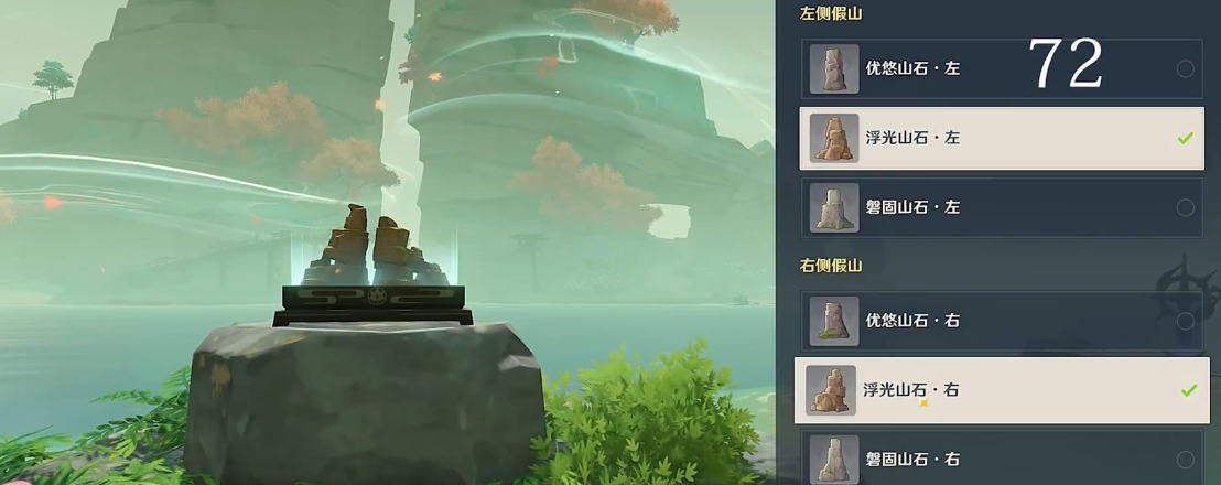 任务起始于布丁岛西北侧小岛的盆景交互处。将盆景右侧调整为浮光山石·右后,前往图示半山腰悬崖与妖狸豆助对话。开启元素视野追踪山顶树墩的风元素痕迹,调查叶片后返回与豆助交谈,确认其同伴柴助因山体变化失踪。需前往盆景处将右侧转换为优悠山石,切换为蒙德风格地形。