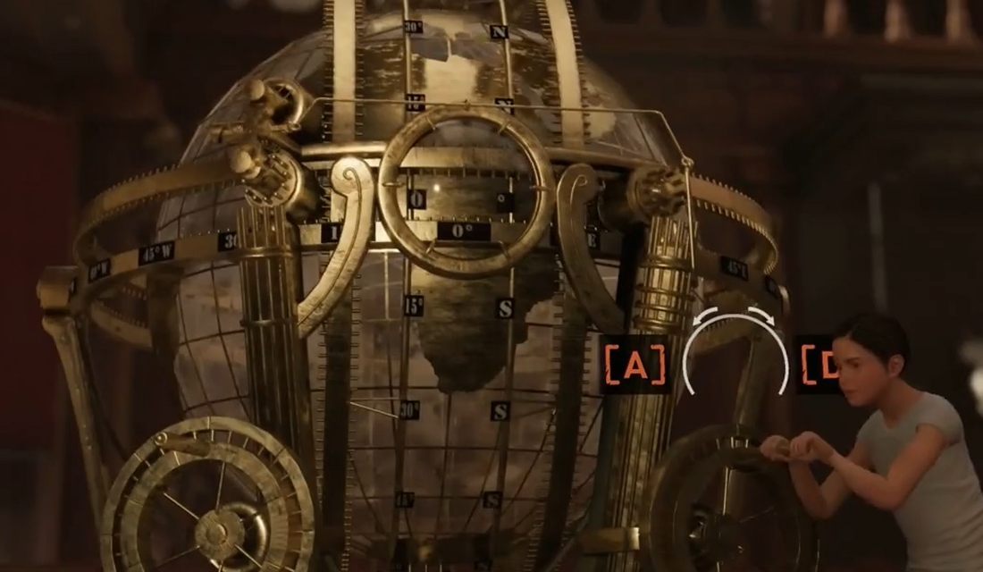 这段流程以解谜为核心,玩家需要操纵年幼的劳拉在克劳馥庄园的书房内完成寻找白皇后的机关挑战。关键操作在于正确调整地球仪坐标至北纬30度、东经90度,触发梯子降下后需前往二层转动轮轴使天花板蝙蝠装置展开双翼,光线透过蝙蝠翅膀投射到一层棋盘,需将两个骑士棋子移至反光处激活白皇后模型。