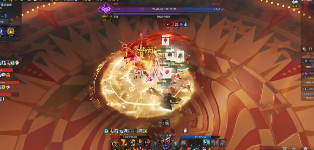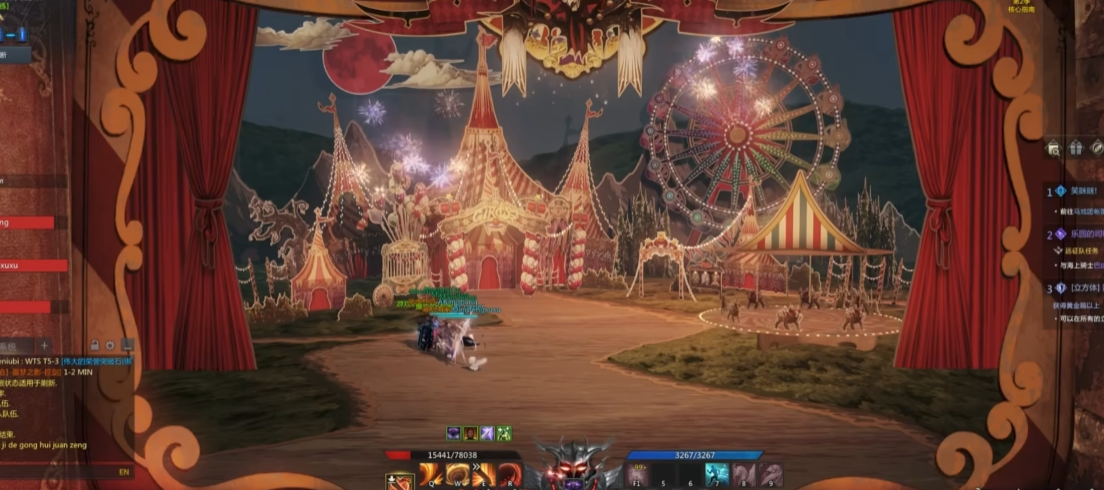 该副本分为三个阶段,每个阶段都有独特的机制和战斗方式,第一阶段主要面对库克的挑战,这个阶段的关键在于处理好小丑召唤的杂兵和舞台机关。玩家需要分配专人负责清理杂兵,同时注意躲避地面上的陷阱和机关。当库克进入特定阶段时会召唤马戏团道具,团队需要集中火力快速击破这些道具,否则会导致团灭。这个阶段的走位要求较高,建议提前规划好移动路线。