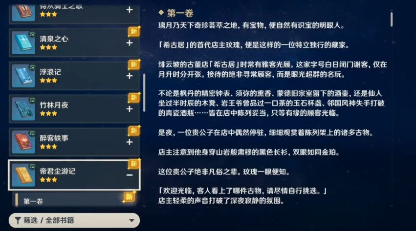 第二卷需前往璃月港下层区域,具体位置在万有铺子老板博来附近的木桌上。从璃月港传送点向码头方向移动,进入负一层商铺区,在博来右手边的桌面上即可找到。若初次探索容易忽略,建议调整视角观察桌面细节。