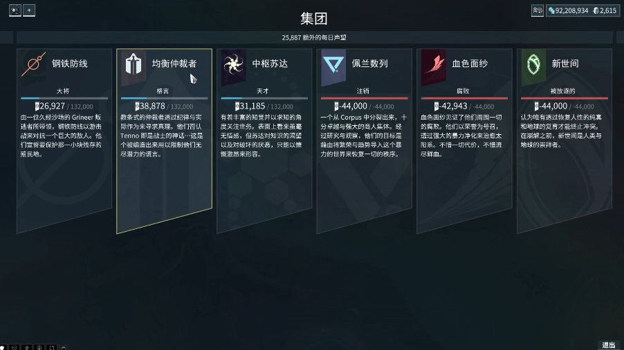 如果急着冲声望,可以去集团商店买增加声望获取的纹章,虽然要花点资源但效率确实高。另外记得和其他集团搞好关系,因为提升均衡仲裁者声望时,他们的盟友集团也会跟着涨一半声望,但对立集团会掉声望。声望等级提升后记得去找NPC交贡品解锁新商品。五级时能买到专属武器和强力战甲MOD,比如让隐身技能消音的静谧无踪,或者增强范围效果的混乱领域这些好东西。