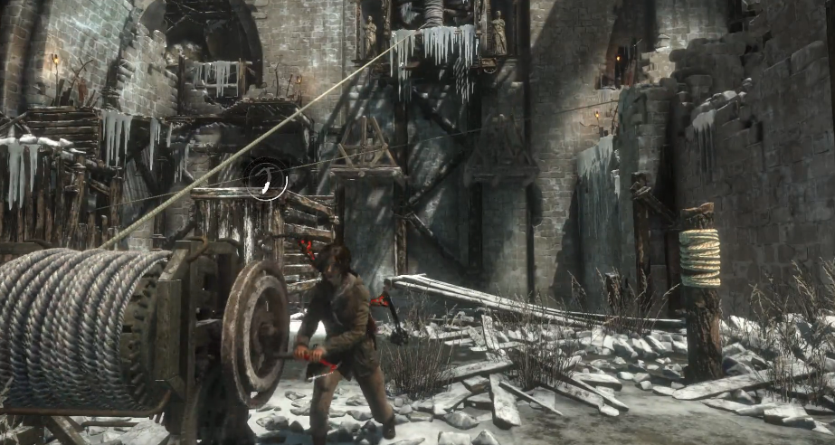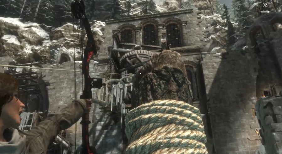 邪恶溪谷其核心挑战在于三平台机关的解谜流程。首先需要操作场地中央的转轮,分三步完成机关联动:射出绳箭连接对面上方的转轴,转动转轮使左右平台形成高低差,随后用绳箭固定转轴位置。注意右侧平台需高于左侧才能继续攀爬。完成基础平台调整后,需攀爬至第二层,再次用绳箭连接远端转轮,并返回一层重新调整平台高度,使左侧高于右侧,最终通过精准跳跃抵达目标区域。