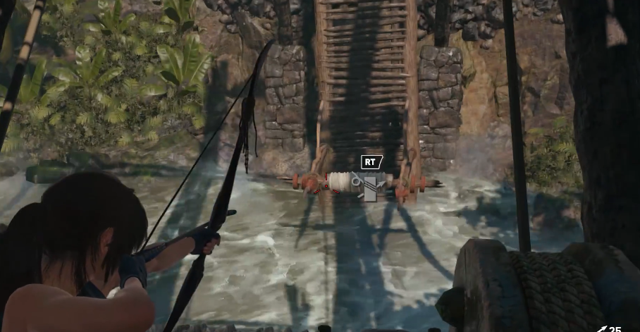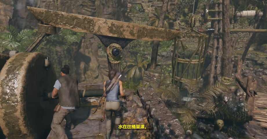 返回底部与乔纳合作推动石轮,将水流导入绿色容器。注意容器存在破损,需在限时内完成后续操作。石轮推至顶端后,迅速从右侧跳至下层平台,利用绳索箭矢连接降下的绳桩与对岸断桥的绳桩。若动作过慢导致容器水量不足,需重新推动石轮激活水流。绳索连接成功后,桥体会部分升起形成通路。
