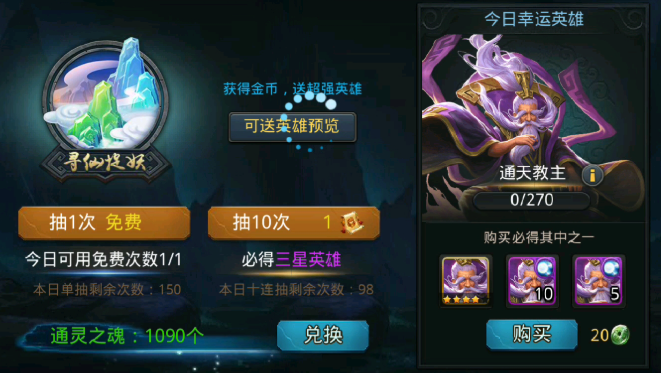 天帝宝库每天有两次免费掷骰子机会,走得越远奖励越稀有,合理利用元宝补充次数能加快进度。寻仙捉妖是获取高级英雄最直接的途径,22小时免费抽一次,十连抽必得三星角色。后期副本如乾坤斗法需要团队配合,阵容搭配和技能释放时机直接影响通关效率,多观察BOSS攻击规律并灵活调整战术。
