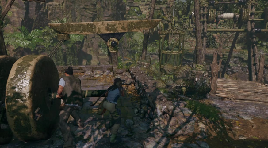 第一个古墓位于秘鲁丛林区域,玩家需在主线推进至获得攀爬斧后才能进入。进入古墓后,沿路径直前行,最终会看到一座高耸的神像遗迹,核心解谜目标是升起神像前的梯子。首先拉动左侧滑车使上方重物上升,远处的小神像会因滑车原理下降。将第一台滑车继续前推至梯子左侧,使小神像与梯子连接。