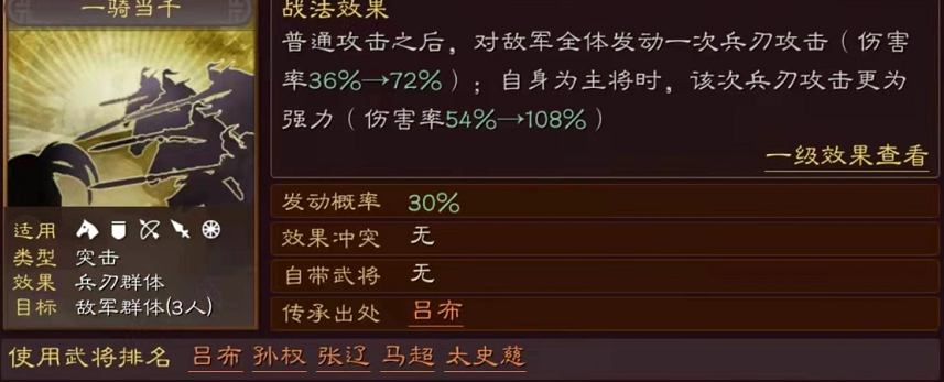 吕布最适合搭配高伤害的突击战法,一骑当千和鬼神霆威是最经典的组合,前者提供群体兵刃伤害,后者强化单体爆发能力,两者结合能最大化输出效果。此外暴戾无仁也是常见选择,它在造成伤害的同时附加混乱控制,不过稳定性略逊于纯输出配置。