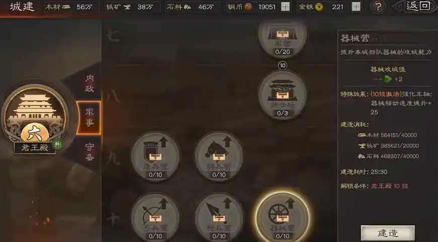 在游戏前期,你需要紧跟着主线任务走,优先升级君王殿以及军事类建筑,比如军营、城防军等,这能直接提升你的城池耐久度和部队带兵上限。资源方面,粮食、木材、铁矿和石料要合理分配,避免盲目消耗。特别是在发育期,铜币不要随意用来刷新将星商店,应该优先保证战法点的充足,因为战法的等级直接关系到你队伍的战斗力。一个常见的误区是过早地升级所有建筑导致资源枯竭,正确的做法是跟随任务指引,有节奏地发展。坚固的城防和充足的预备兵源,是你应对任何来袭的第一道屏障。