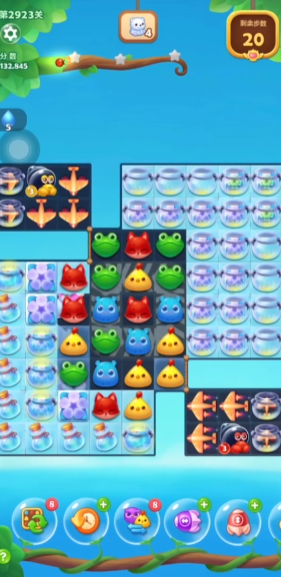 开局的核心思路是先激活水母。具体操作上,建议先将蓝色的河马与小熊交换位置,这样能快速清除掉一部分小动物,同时激活上方的水母。通过交换青蛙和小熊,可以同时激活两个水母。这一步非常重要,因为激活后的水母能有效帮助我们清理下方的障碍,为后续操作打开局面。开局不要乱点,围绕激活水母这个目标来走,能节省很多宝贵的步数。
