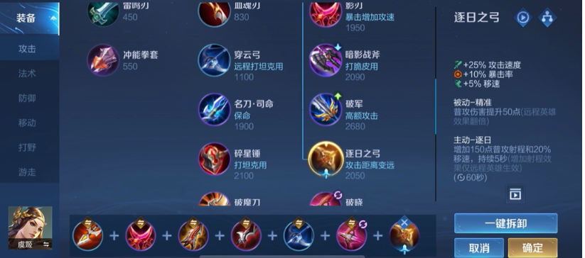 虞姬的出装顺序通常从鞋子开始,抵抗鞋能减少控制效果的影响,之后优先合成无尽战刃和闪电匕首来提升暴击和攻速。中期装备选择破晓,这件核心装备提供攻速、暴击和破甲,全面增强虞姬的伤害能力。后期可以补上泣血之刃或末世来维持生命值,根据战局需要选择破军或魔女斗篷。这套路线能确保虞姬在游戏后期拥有稳定的输出和一定的自保手段。