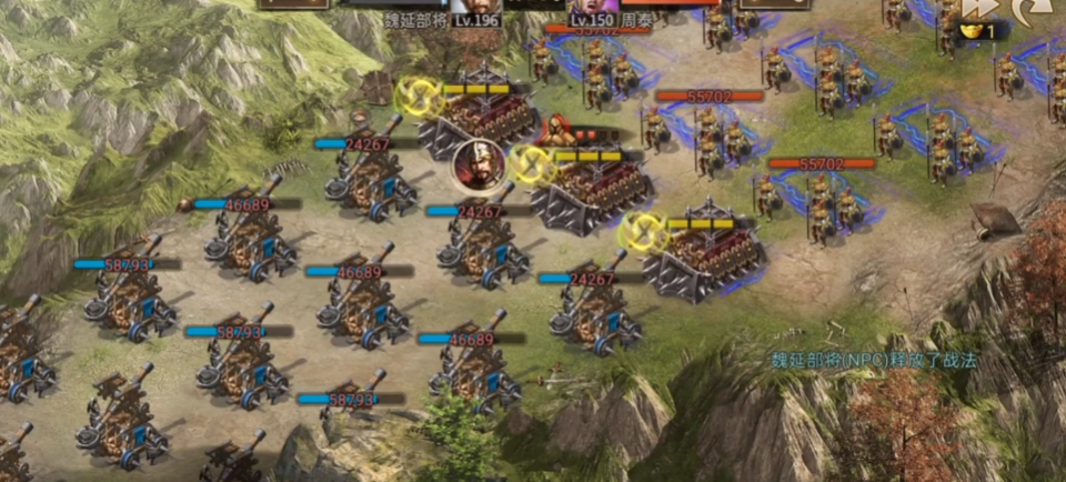 第三位出场的武将选择夏侯渊,给他配上烛龙套装。他的核心作用是利用战法封住敌将的技能,尤其是在面对第三或第四个敌将时,看准时机释放战法进行干扰,能大大减少我方队伍承受的伤害。第四位则轮到周泰出场,他穿霸下套装,由于自身没有战法,就是依靠普攻和战车进行稳定的输出。周泰需要顶住压力,利用战车一格一格地砍掉敌方的兵力,理想情况下他可以处理掉多排敌人,为最后的收割铺平道路。最后收关的重任就交给关羽了,他穿灵龟套装,需要憋住觉醒战法,一定要留到面对最终BOSS魏延,并且魏延只剩最后几排兵的时候再释放,这招往往能一举奠定胜局。