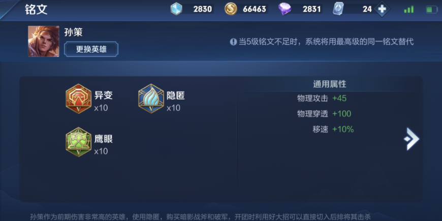 铭文的搭配也至关重要,好的铭文能让你开局就领先别人一步。比较通用和推荐的一套是蓝色带10个隐匿,绿色带10个鹰眼,红色带10个异变,这就是常说的百穿铭文组合。这套铭文能提供大量的物理攻击和物理穿透,让你前期的技能伤害非常可观,清兵和消耗对手都更有效率。蓝色隐匿增加的移速也能让你跑图支援和开船的时候感觉更灵活一些。有些玩家可能会在里面混搭一两个祸源铭文拼一下暴击的运气,但如果你是新手,还是建议用标准的百穿套,伤害最稳定。