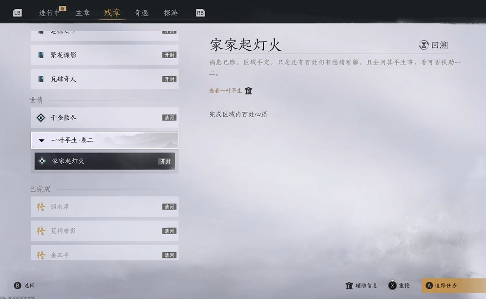 一叶平生卷一任务涉及多个步骤,包括调整游戏时间到次日午时前往天京渡与招工头子对话,接着调查着火的房子与争执的夫妇交谈并偷听附近闲言碎语,然后追踪鬼祟之人获取线索并同意接活,之后跟随工头到工作地点调查异常之处和外面的尸体,跟随纸钱找到哀悼者并击败罪犯,抓住陆三儿游街示众使其认罪,最后与张安康讨论事件并通过组合短语回答问题来完成叶宴第一部分,同时进行无叶书任务听盲人女孩郑然讲故事并送她回家,查看不死树旁石碑了解历史,追上周二狗后触发六个小任务如点穴定住周二狗、救付温书并用悬壶能力疗伤、救商人、击败酒馆混混获取菜谱、找刘芬并带她回家,全部完成后解锁归来客任务与潘阿公对话。