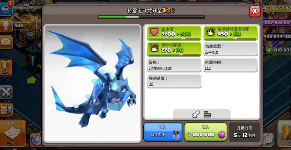升级雷电飞龙需要投入巨量的圣水资源和相当长的时间。根据不同的等级跨度,从一级升至二级通常需要九百万圣水,研究时间需要十天。而从二级升至三级则耗费一千一百万圣水,研究时间延长至十四天。这些资源需求意味着玩家在决定升级前,需要确保圣水采集器有足够的储备,或者通过进攻等手段积累资源,以应对这笔庞大的开销。
