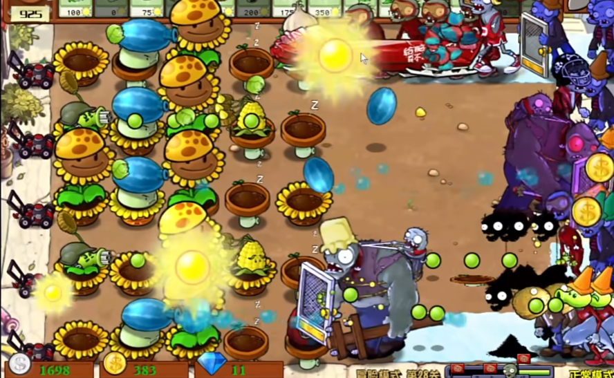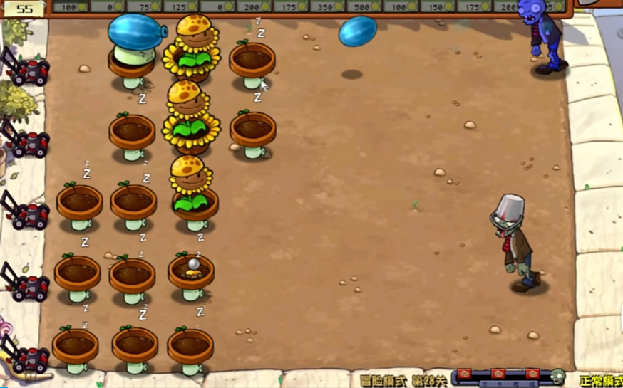 在最后的防御完善阶段,你需要构建最终防线以抵挡最强力的僵尸进攻。此时应将防御重点进一步转向右侧,在最右侧的后排位置补充部署多个冰冻西瓜大喷菇。这种植物不仅能造成可观的群体范围伤害,其附带的减速效果能极大延缓僵尸群的推进速度,是后期控场与输出的核心。在冰冻西瓜大喷菇前方,需要继续补充磁力坚果,形成坚固的保护墙,确保后排输出单位的安全。在整个关卡过程中,要始终留意僵尸的进攻节奏,将寒冰窝瓜和樱桃辣椒这类一次性消耗植物留作应急手段,在僵尸大量聚集或高强度僵尸突破防线时及时使用。仙人三叶草则用于专门应对可能出现的气球僵尸,避免它们绕过你的地面防线。