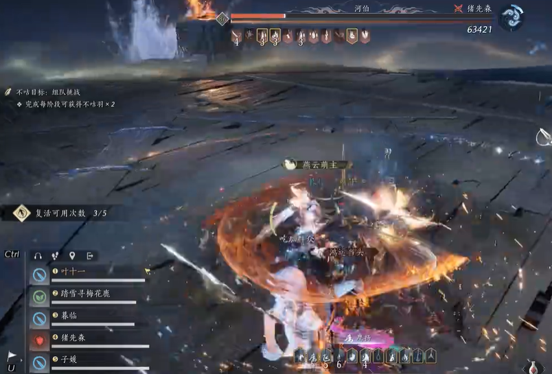采用团队协作的常规打法要求队员间有明确的职责分工。当河伯释放大范围光圈形态的海浪攻击时,团队需要执行特定的应对策略:一名擅长机动跳跃的队员负责吸引河伯的仇恨并引导其行动,而其他队员则应立即前往场景角落的火柱上躲避。负责吸引仇恨的队员需要通过跳跃来规避海浪的冲击,在火柱上的队员则安全等待本轮机制结束,随后再下地集火输出。在后续循环中,继续注意躲避地面的黄光区域,承伤队员可以适当将河伯拉近火柱位置,以为下一次大范围光圈海浪来临时团队快速上柱做好准备。当核心机制被成功处理完毕后,团队便可抓住机会集中火力将其击败。