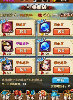 游戏中有一个专门的集市系统,这里每天都会刷新商品,其中就包括可以直接用元宝购买的天命石。不过这里购买的价格通常是15元宝一个,对于大多数平民玩家或者微氪玩家来说,直接用元宝购买性价比不算特别高,除非是特别紧急的情况,比如当天就差几个石头就能完成天命升级,不然一般不建议作为主要的获取来源。相比之下,游戏中还有一个神将商店,这个商店每隔两小时就会自动刷新一次商品,有很大的概率会刷出天命石来。在这里兑换就灵活多了,你可以选择花费10个将魂来购买一个天命石,将魂是通过武将分解等途径获得的,如果攒得比较多,用将魂来换天命石是非常划算的选择。这里也支持用10元宝购买,但同样不推荐优先使用元宝。