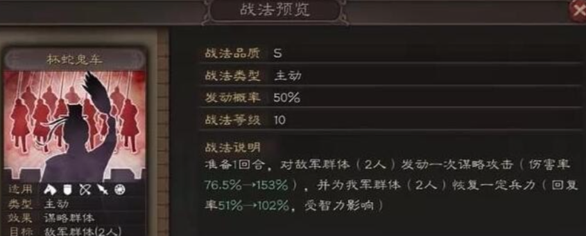 战法选择需围绕强化控制与生存展开,推荐夺魂挟魄窃取属性增强坦度,杯蛇鬼车兼顾回复与输出,辅助类战法如八门金锁阵可降低敌方初始伤害。若作为副将,可携带挫志怒袭补充群体虚弱或料事如神降低敌方伤害率。兵书方面优先选择虚实+疾战突围+将威组合,通过跳过准备回合提高战法释放频率,次选九变+援其必攻+励军增强团队辅助能力。