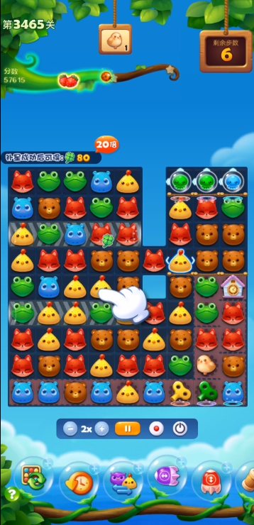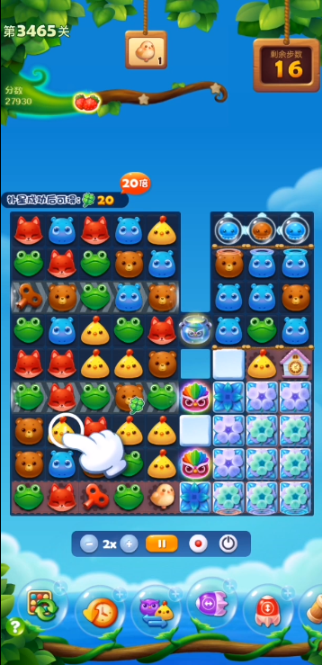 魔力鸟出现后不要单独使用,与直线特效或爆炸特效交换,可触发大范围清屏效果,快速清除多层雪块与成片冰块,尤其适合清理两侧与底部难触及的区域。特效组合释放时尽量对准冰块密集区,一次操作就能完成大量目标进度,大幅节省步数,让有限步数发挥更高效率,避免零散消除导致步数不足。