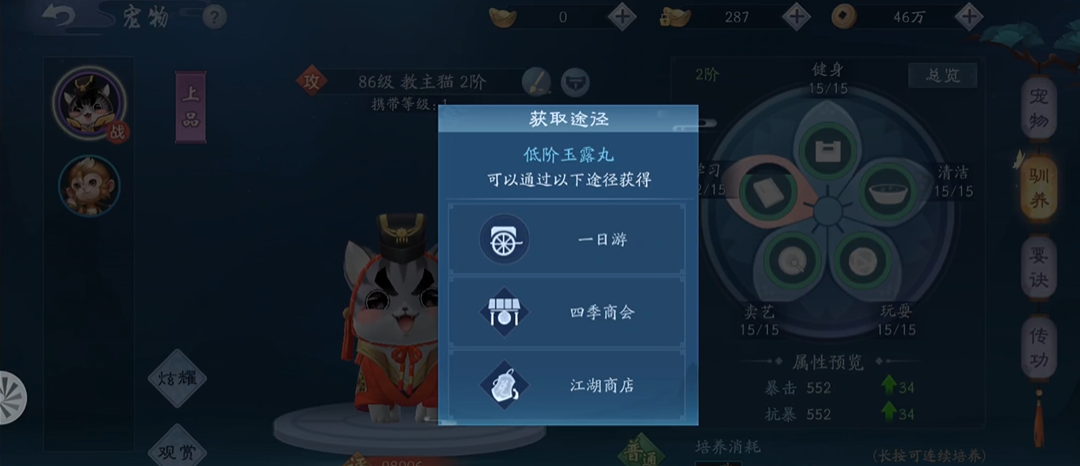 宠物系统100级解锁洗髓,是属性跃升关键。优先培养攻击、防御型橙品宠物,消耗洗髓丹随机调整资质,提升核心属性;对单项资质不满意时,用雪莲丹定向强化,每天限5次;同时完成驯养全满,提升属性转换比,学习橙色及以上要诀并钻研升级,PVE带攻击宠、PVE带防御/辅助宠,保持健康、饱腹、精神状态满值,避免触发不良效果。