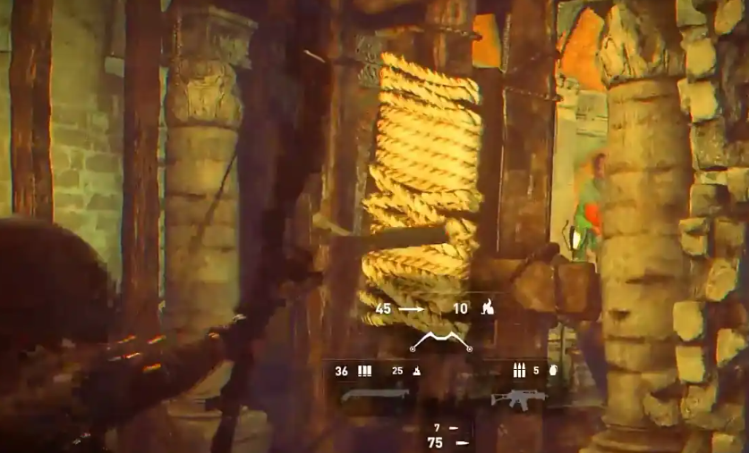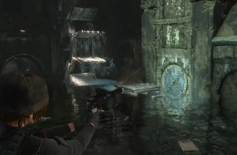 首先找到伐木场的起重机,这里悬吊着一根原木,用枪械射击原木上方的脆弱部分,坠落的原木会砸开地面木板形成入口。进入后沿着黑暗洞穴前进,听到水流声时跳到右侧石壁,攀爬下去到达下方洞穴。注意空中的横木,跳上去打开闸门,观察下方旋转叶片的缺口,找准