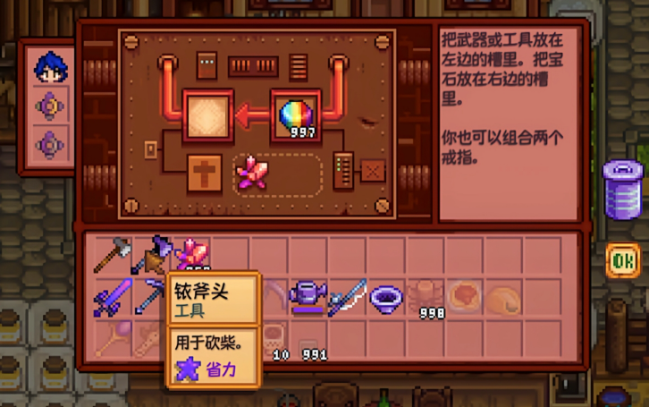 武器附魔是提升战斗力的重要方式,在火山矿洞的锻造台就能进行。每次附魔需要消耗1个五彩碎片和20个火山晶石,效果是随机生成的,但可以通过反复附魔来刷出想要的属性。镰刀和回程魔杖不能附魔,其他工具和武器基本都可以。附魔后的效果会永久保留,即使升