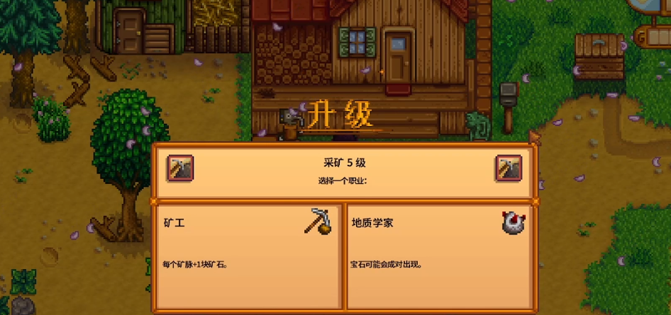 采矿技能达到5级时,玩家需要在矿工和地质学家两个职业方向中做出选择,这个选择将影响你后续获取资源的效率和策略重心。矿工职业的核心效果是让每个矿脉额外多掉落一块对应的矿石,这意味着你每次敲碎铜矿、铁矿或金矿脉时都能多得一块,这对于游戏前期急需