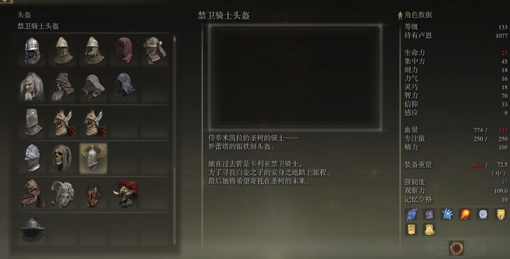 禁卫骑士套装是一套经典的中世纪骑士铠甲,以其威严外观和均衡防御性能成为后期玩家的热门选择,获取它需要击败特定BOSS圣树骑士罗蕾塔,随后在圆桌厅堂购买完整部件。这套装备由头盔、铠甲、臂甲和腿甲组成,整体质感厚重且带有皇家护卫风格,核心部件铠