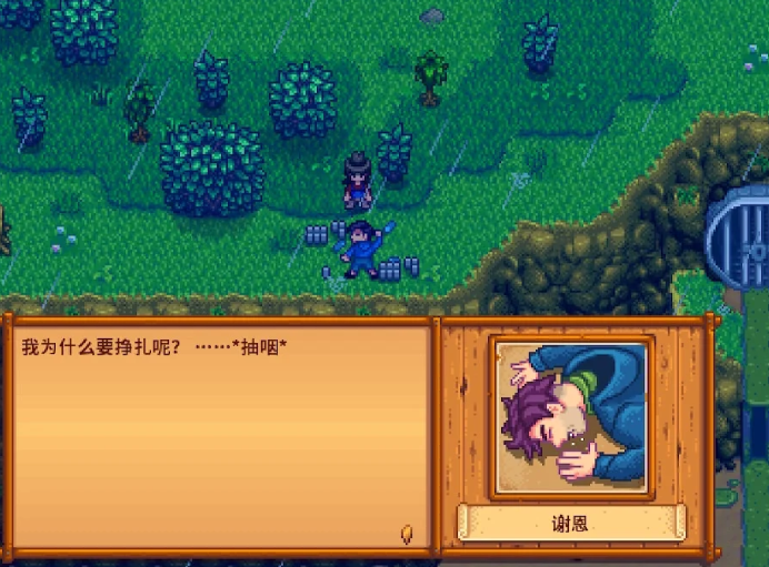下雨天的早上9点到晚上8点之间,咱们需要进入煤矿森林。这时候会发现谢恩倒在悬崖边,周围全是酒瓶。他会表达对生活的绝望,甚至想跳下去。系统会给出四个对话选项,不过别太纠结选哪个,因为无论选什么,结果都一样——咱们会劝他去医院接受治疗,第二天他还会专门来道谢。
