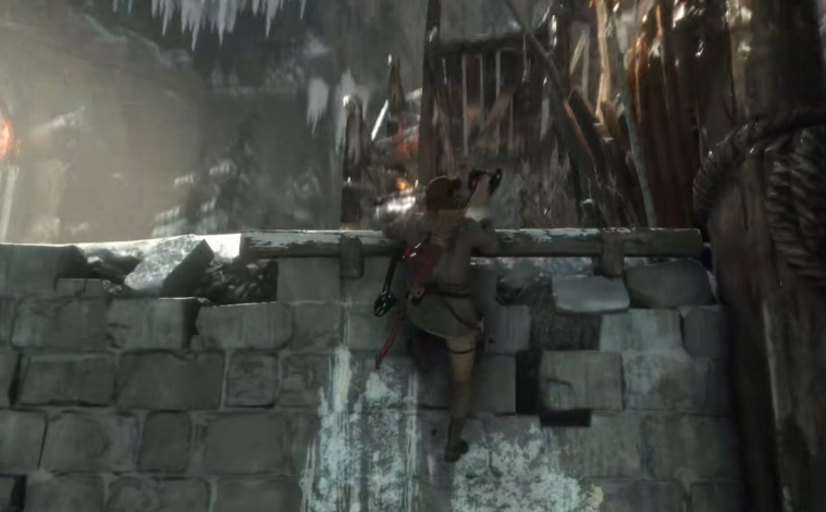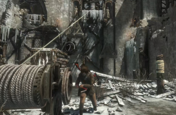 打开邪恶溪谷大门的话,咱们得先装备上弓箭,然后瞄准悬崖右上方的齿轮轴承,按下鼠标左键对其发射绳索,最后再把绳索的另一端绑到其下方的转轮轴承上。这样一个可以进行联动的机关就搭建完成了,这个时候需要走到转轮轴承的右方,按下交互键进行转动。当转轮不能转动后,悬崖上的两个木板会有所变动,其中左边的木板会降低至最地处。