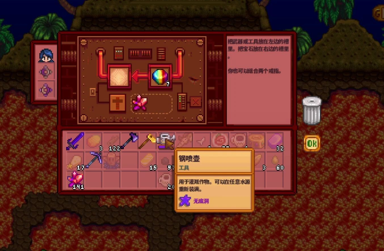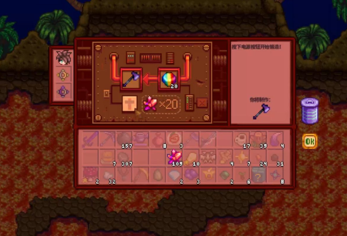 武器附魔是提升战斗力的重要方式,在火山矿洞的锻造台就能进行。每次附魔需要消耗1个五彩碎片和20个火山晶石,效果是随机生成的,但可以通过反复附魔来刷出想要的属性。镰刀和回程魔杖不能附魔,其他工具和武器基本都可以。附魔后的效果会永久保留,即使升级也不会消失。