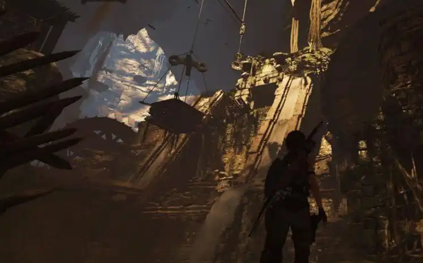 将第一蓄水池中的木栈板踢过中央缺口至第二蓄水池附近,需返回入口再次拉动机关使水位满起。利用浮起的木栈板跳上平台时需注意时间限制,平台会在水位变化后复位。清除沿途敌人后,在尽头找到水车机关,需先将木栈板与水车相连,待栈板被拉至水车平台时立即切换连接目标——将水车与高处悬吊石环绑定。此步骤需精确把握时机,水车拉动石环会触发中央升降平台。