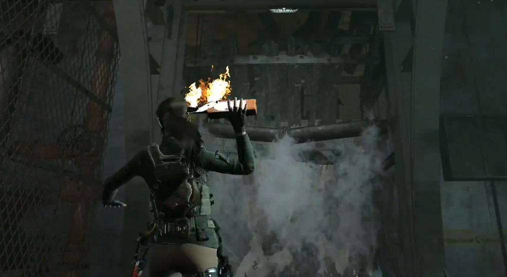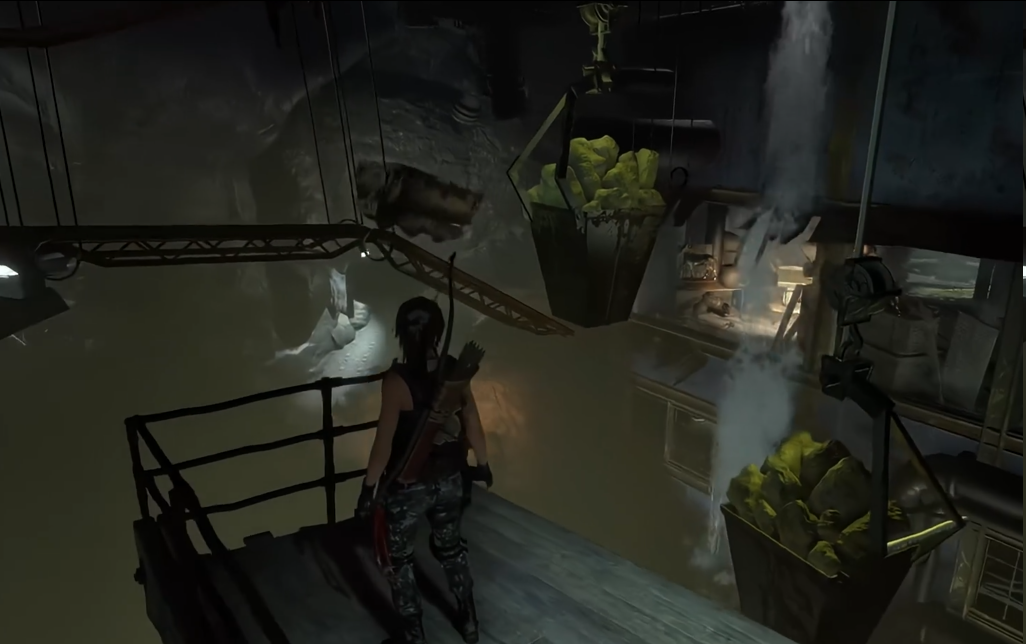解谜时需要先跳到悬吊的吊斗上,让轨道上的两辆矿车坠落。然后爬到上层平台,用绳索拉出新的矿车,它会沿轨道滑下来被对面的吊斗挡住。接着转身用横杆跳到对面集装箱顶部,用绳索把矿车和柱子绑在一起。回到平台再次跳到吊斗上,这次矿车会悬吊在水流下方挡住水流。最后一步是跳到中央高台,拾起酒瓶制作汽油弹扔到对面墙上烧毁布料,就能跳进窗口了。从右侧楼梯上去就能找到手抄本存放处,阅读后学会明眼之人技能,这个技能可以提升求生本能,让附近的陷阱自动发光。