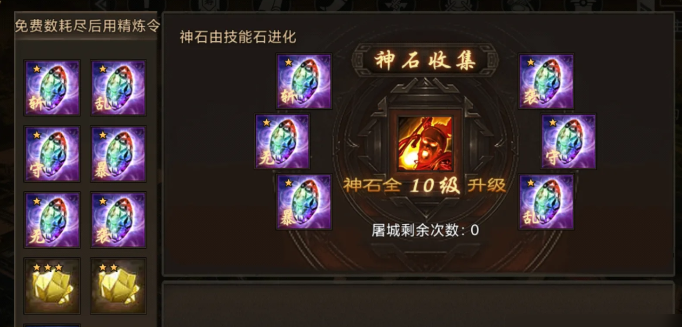 六神石系统是提升角色战斗力的核心机制之一,分别代表力量、智慧、防御、速度、生命和幸运六种属性。神石进阶需要消耗特定数量的晶石,从1阶升至2阶需投入10个1级晶石,每个晶石增加10%进度;2阶至3阶需34个1级晶石,每个增加3%进度;3阶至4