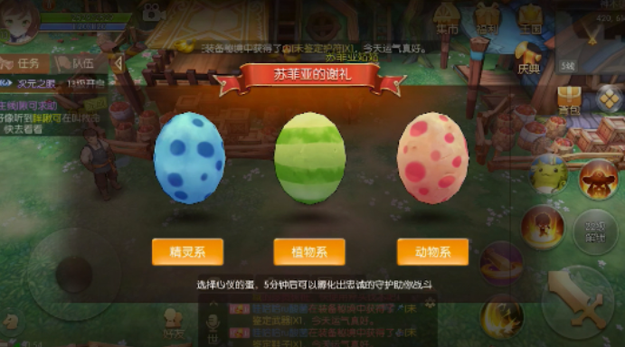 我们会遇到一个叫苏菲亚的NPC,她会送咱们一份谢礼,让咱们从精灵系、植物系、动物系三个宠物蛋中选一个。这三个宠物蛋分别是老鼠模样的精灵系、蘑菇造型的植物系和另一个记不清具体样子的动物系。其实选哪个都差不多,因为它们都属于前期过渡用的宠物,后