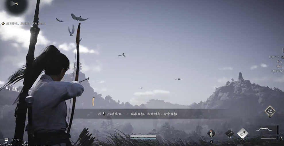 射下飞得最高的鸟是一个考验玩家精准度和技巧的环节,玩家需要前往游戏世界中的北竹林区域启动这个挑战。与NPC蓉蓉对话后,任务正式触发,玩家会收到指示去瞄准并击落高空中的鸟只,这为游戏增添了探索和动作体验。射鸟过程的核心在于使用弓箭武器,玩家应